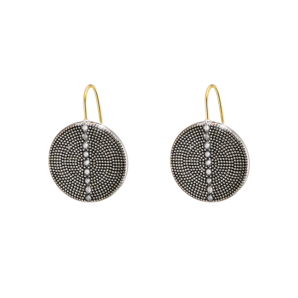 Cercei rotunzi cu aspect vintage realizati din aliaj placat cu ruteniu, rodiu si aur galben de 18 K decorati cu pietre cubic zirconia incolore. Recomandari de purtare: