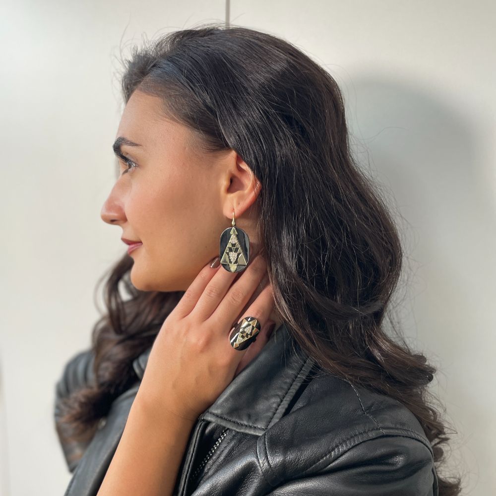 Cercei statement realizati din metal comun placat cu aur galben de 18K si ruteniu decorati cu model abstract si pietre cubic zirconia incolore.
