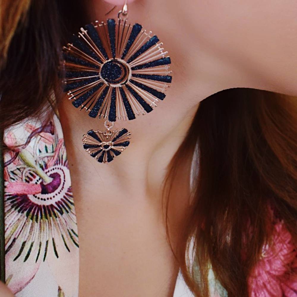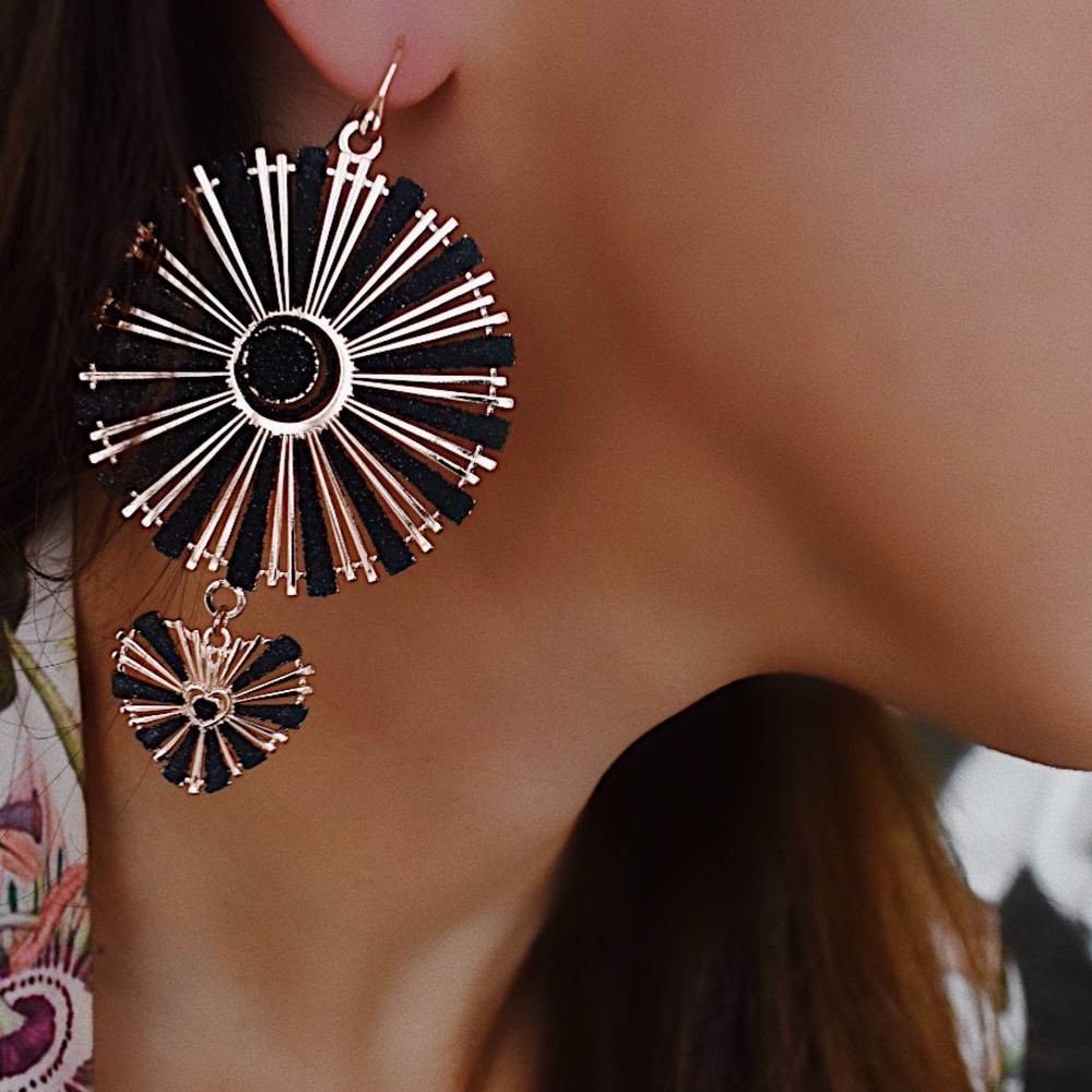 Cercei inediti realizati din aliaj placat cu aur roz de 18 K decorati cu un element cerc si unul inima peste care se regaseste glitter negru. Recomandari de purtare: