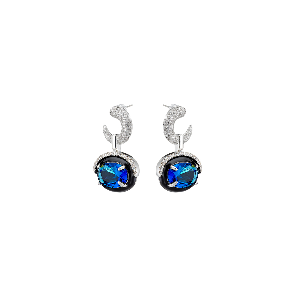 Cercei cu surub realizati din metal comun placat cu rodiu decorati cu email negru si pietre cubic zirconia albastre.