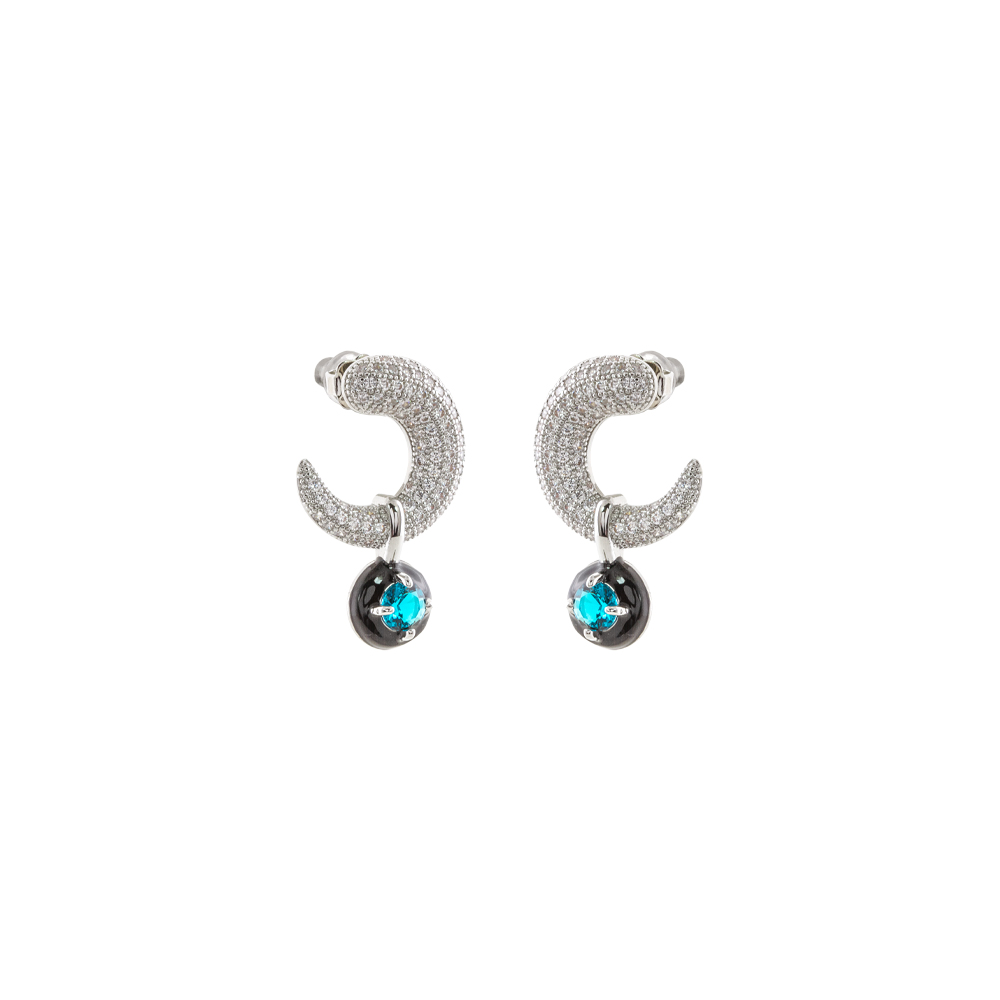 Cercei cu surub realizati din metal comun placat cu rodiu decorati cu email negru si pietre cubic zirconia albastre.