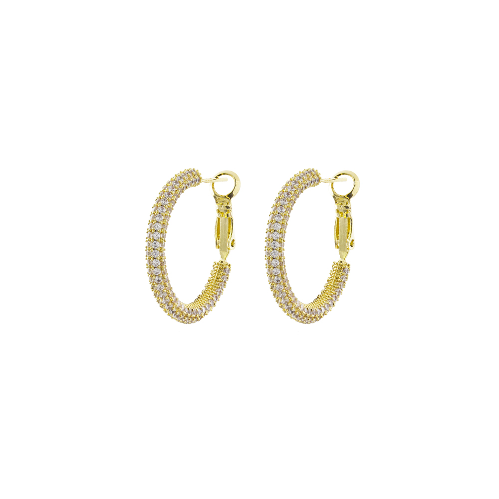 Cercei rotunzi realizati din metal comun placat cu aur galben de 18K si decorati cu pietre cubic zirconia incolore.