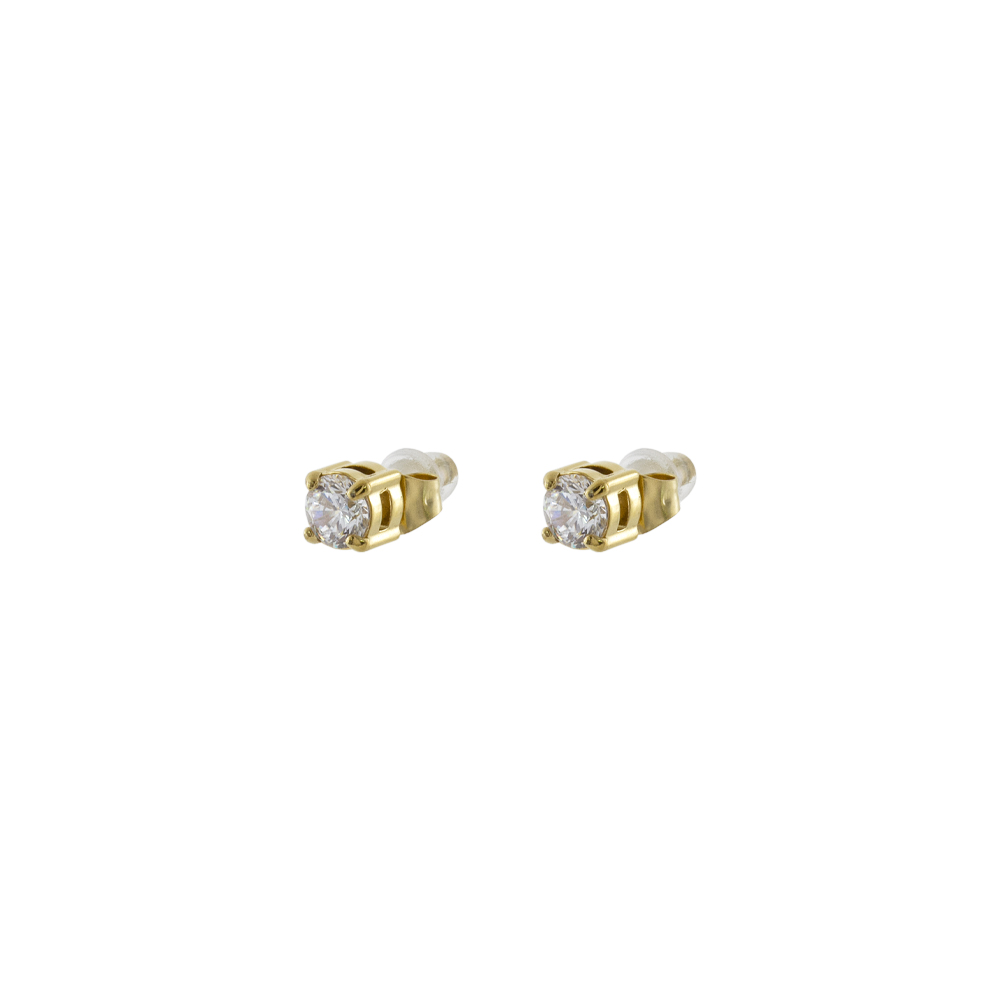Cercei pe ureche realizati din otel inoxidabil placat cu aur galben de 18K decorati cu pietre cubic zirconia incolore.