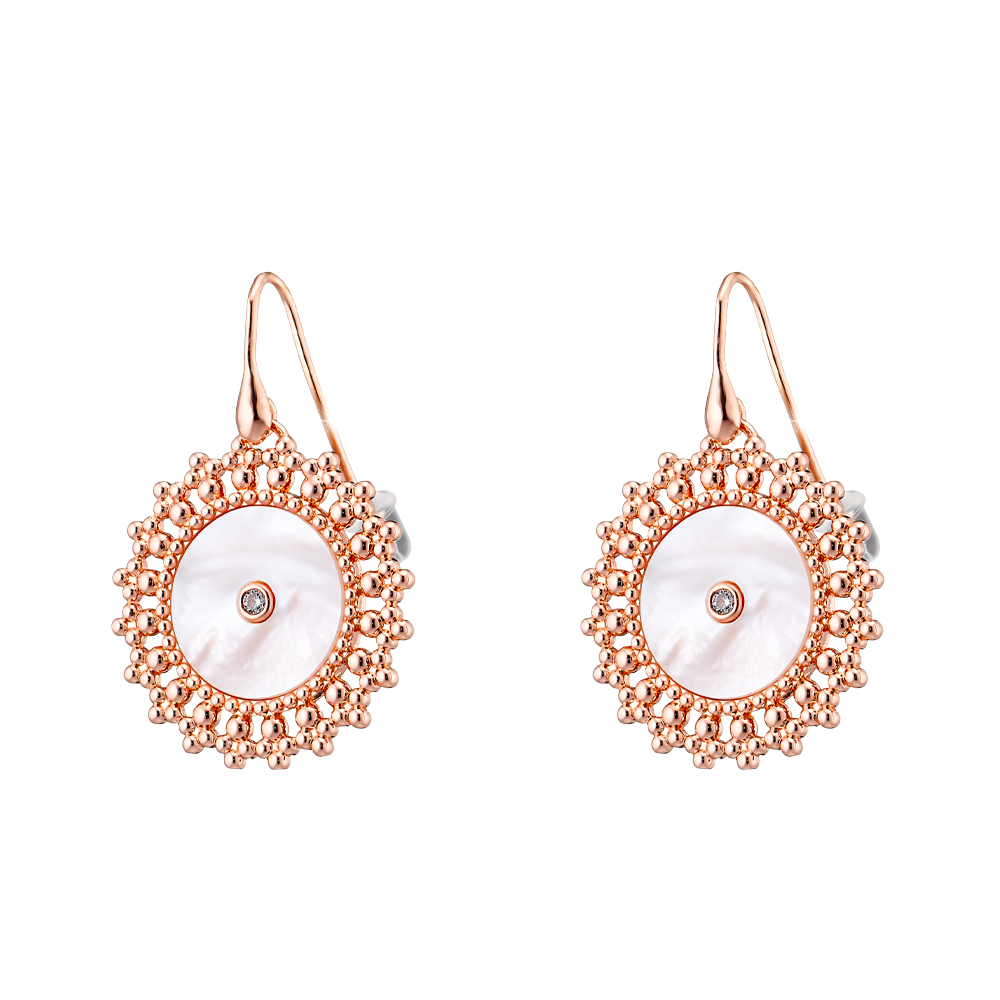 Cercei medii realizati din metal comun placat cu aur roz de 18 K decorati cu sidef si pietre cubic zirconia incolore. Recomandari de purtare: