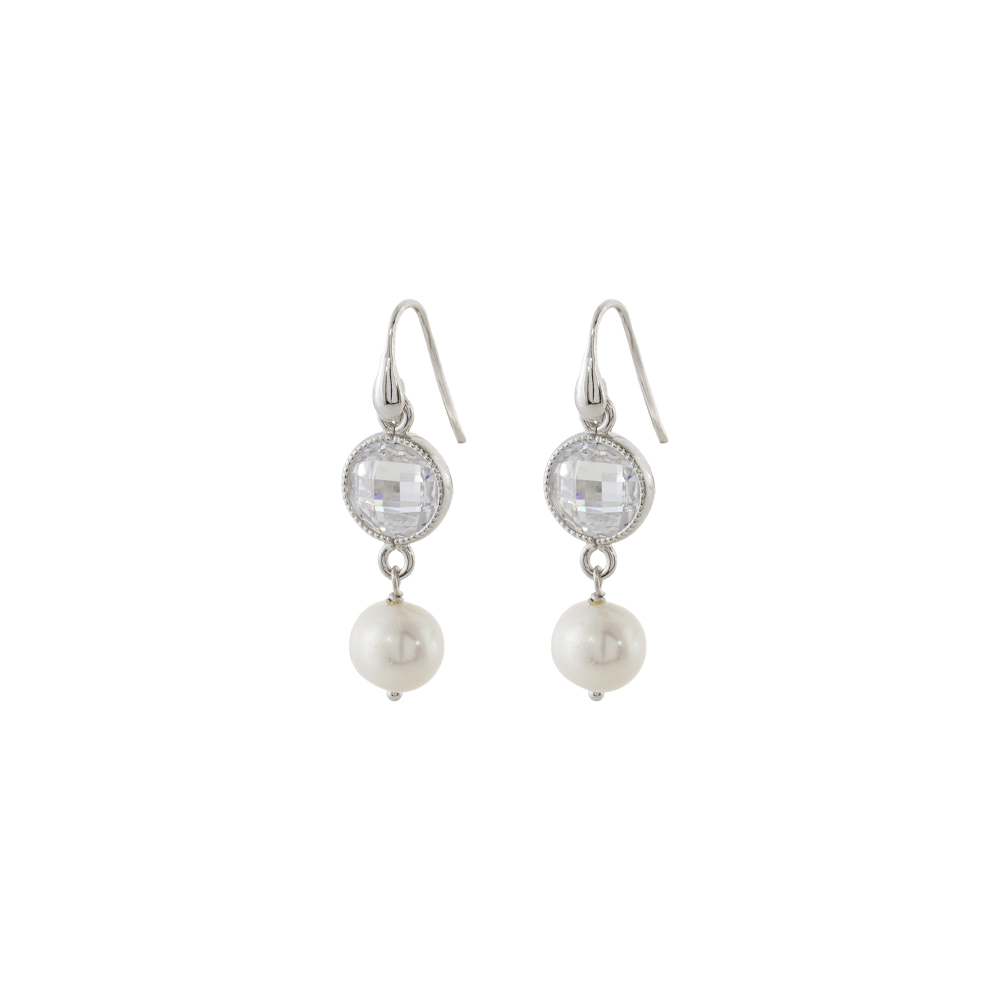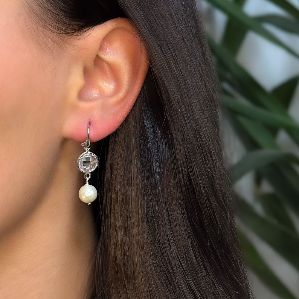 Cercei eleganti cu tortita realizati din argint 925 placat rodiu decorati cu pietre zirconia incolore si perle de cultura.