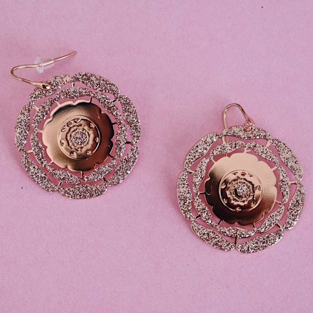 Cercei eleganti realizati din aliaj placat cu aur roz de 18 K decorati cu elemente sub forma unor trandafiri presarati cu particule fine de glitter. Recomandari de purtare: