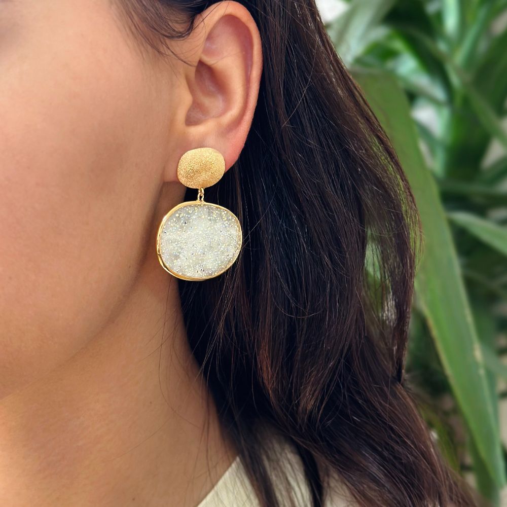 Cercei eleganti realizati din argint 925 placat cu aur galben de 18 K decorati cu elemente ovale, cele mari fiind presarate cu cristale caviar albe.