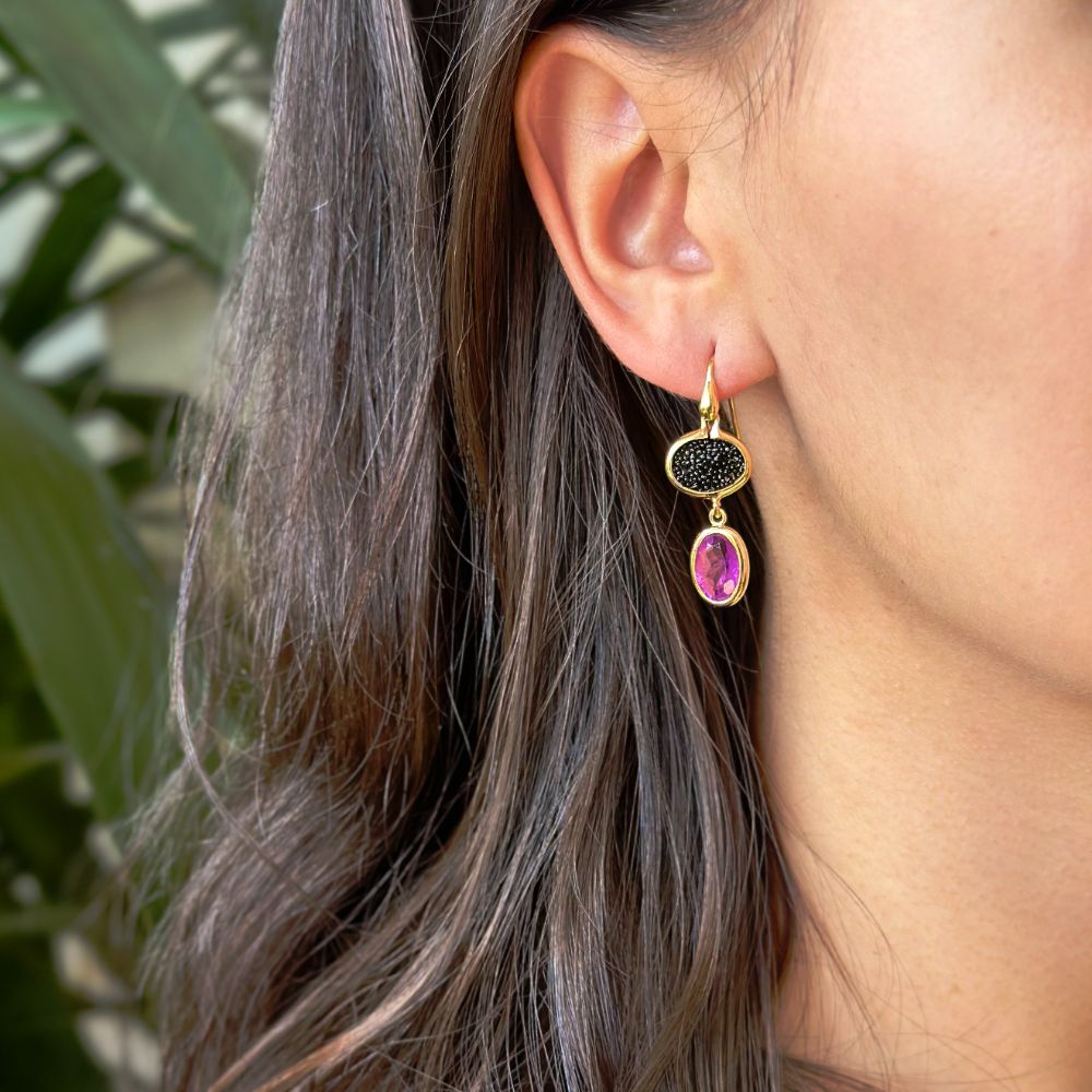 Cercei eleganti realizati din argint 925 placat cu aur galben de 18 K decorati cu pietre cubic zirconia fucsia si cristale caviar negre.