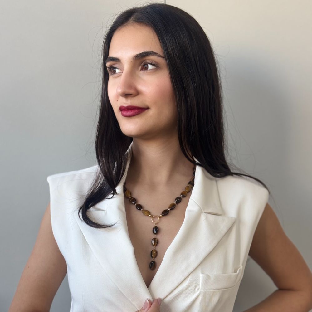 Poarta colierul intr-o tinuta de zi cu influente naturale, peste o camasa bej sau kaki, usor descheiata. Se potriveste cu pantaloni din bumbac sau in si incaltaminte joasa, tip mocasini sau sandale simple. Ochiul de tigru va adauga profunzime si caldura, fara sa incarce tinuta.