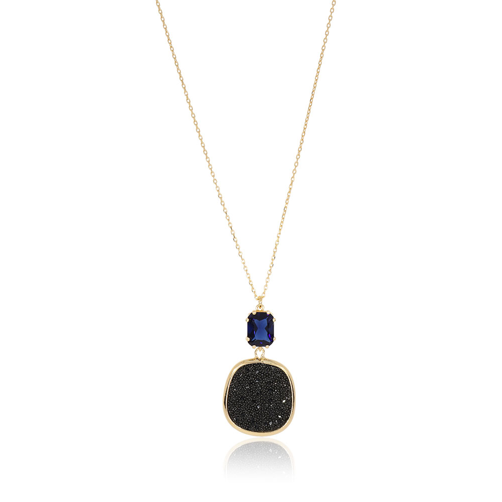 Colier scurt realizat din argint 925 placat cu aur galben de 18K decorat cu pandantiv presarat cu cristale caviar si piatra cubic zirconia albastra.