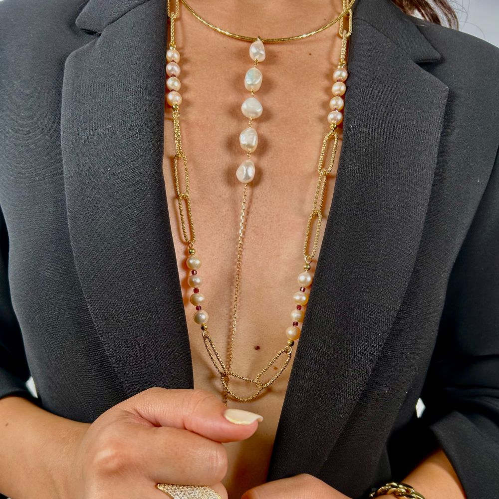 Pentru ocazii speciale, poate fi purtat alaturi de o rochie neagra sau in nuante pastelate, evidentiind eleganta si delicatetea perlelor. In schimb, pentru un look casual-chic, combina colierul cu o camasa alba cu nasturi lasati deschisi sau un sacou modern, subliniind astfel accentele aurii.