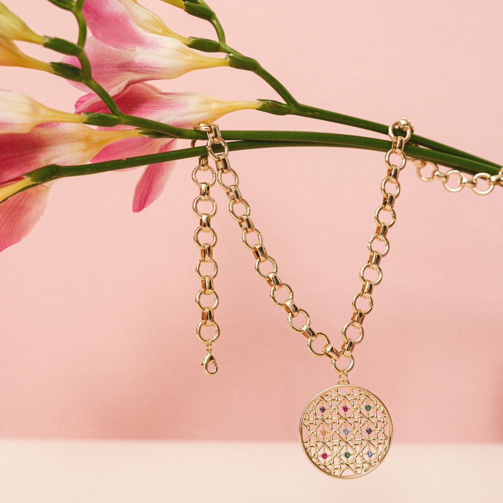 Colier cu zale placat cu aur galben de 18 K cu pandantiv rotund si pietre multicolore Basket
