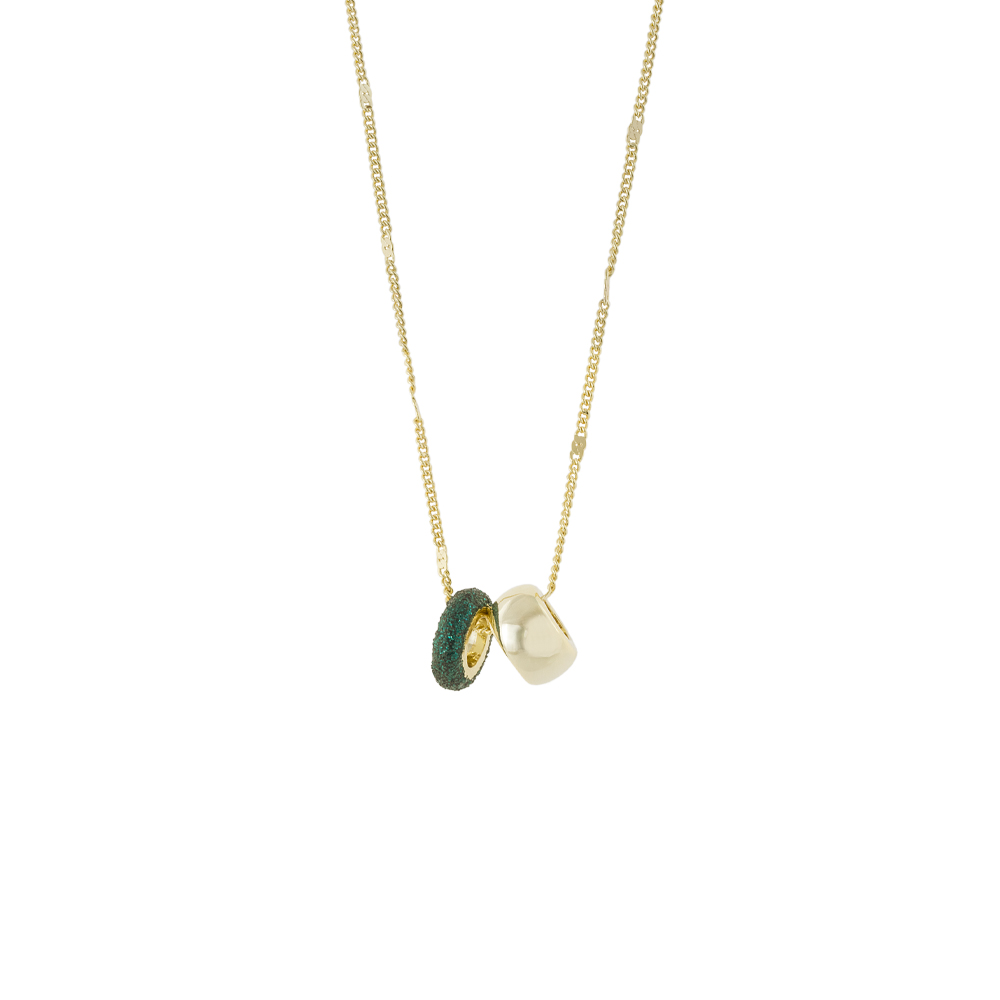 Colier scurt realizat din metal comun placat cu aur galben de 18K decorat cu 2 pandantive sub forma de inele dintre care unul e presarat cu glitter verde.