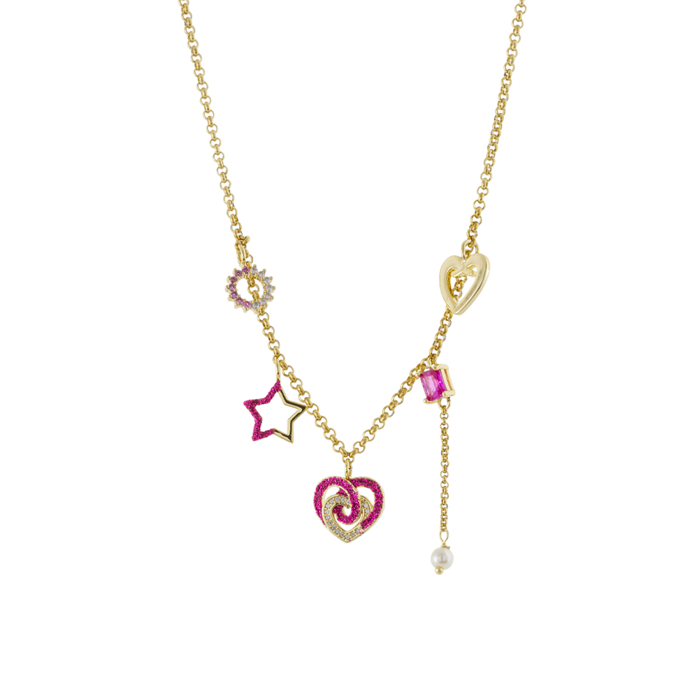 Colier scurt realizat din metal comun placat cu aur galben de 18K decorat cu pandantive diverse presarate cu glitter roz si pietre cubic zirconia incolore.