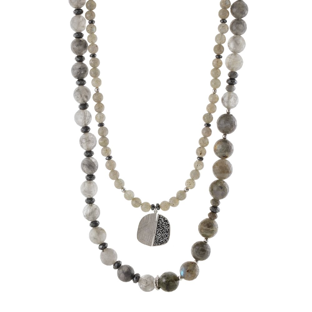Colier dublu realizat din argint 925 placat cu rodiu decorat cu labradorit, hematit gri si pandantiv cu cristale caviar .