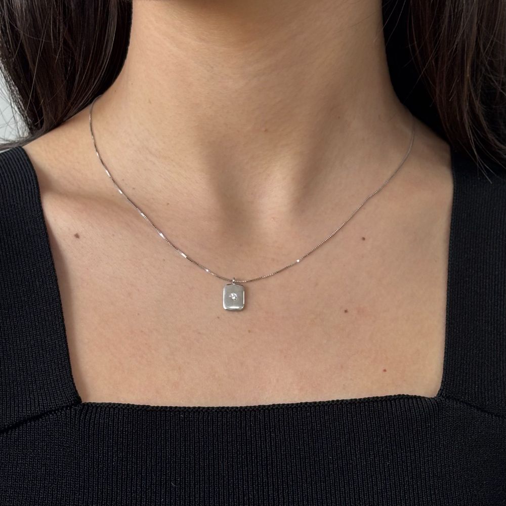 Colier scurt realizat din argint 925 placat cu rodiu decorat cu u un pandantiv mic, dreptunghiular cu margini rotunjite si cristal zirconia.