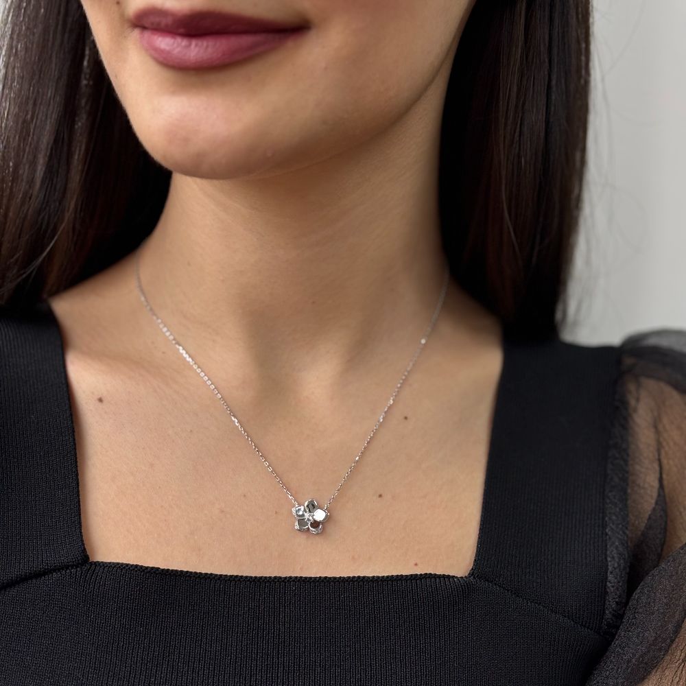 Colier scurt realizat din argint 925 placat cu rodiu decorat cu pandantiv floare cu petale stilizate si cristale zirconia.
