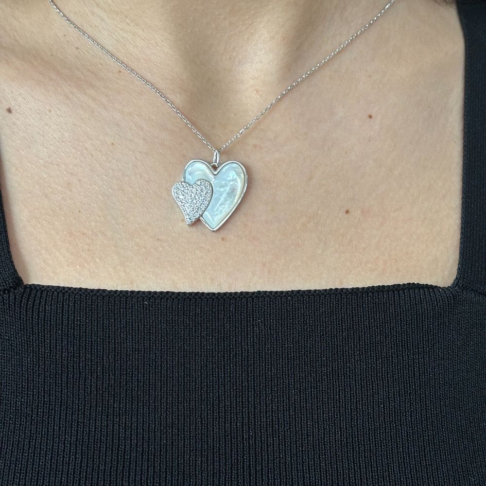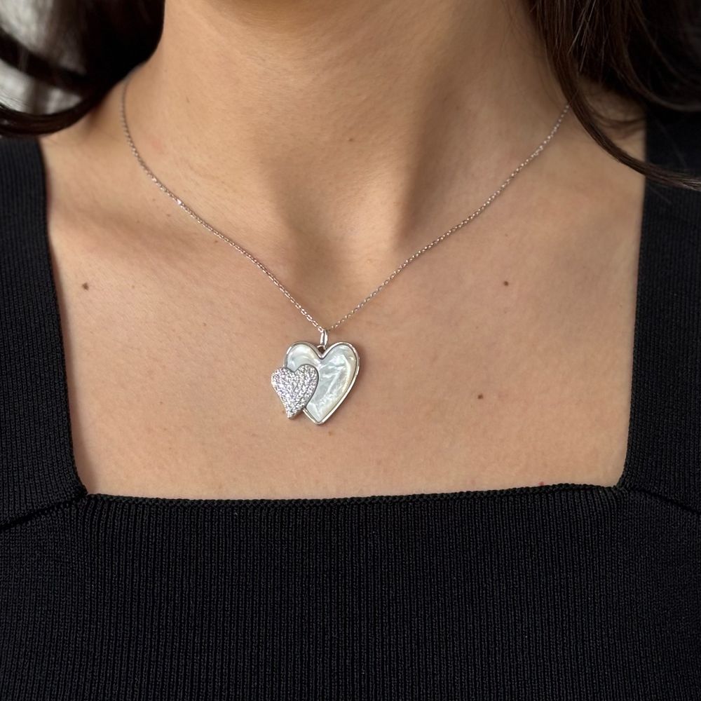 Colier scurt realizat din argint 925 placat cu rodiu, decorat cu pandantiv sub forma a doua inimi suprapuse, cu sidef si cristale zirconia.