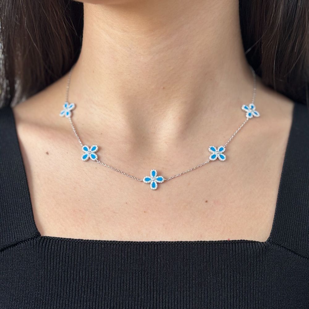 Colier realizat din argint 925 placat cu rodiu decorat cu pandative floare cu email albastru si cristale zirconia incolore.