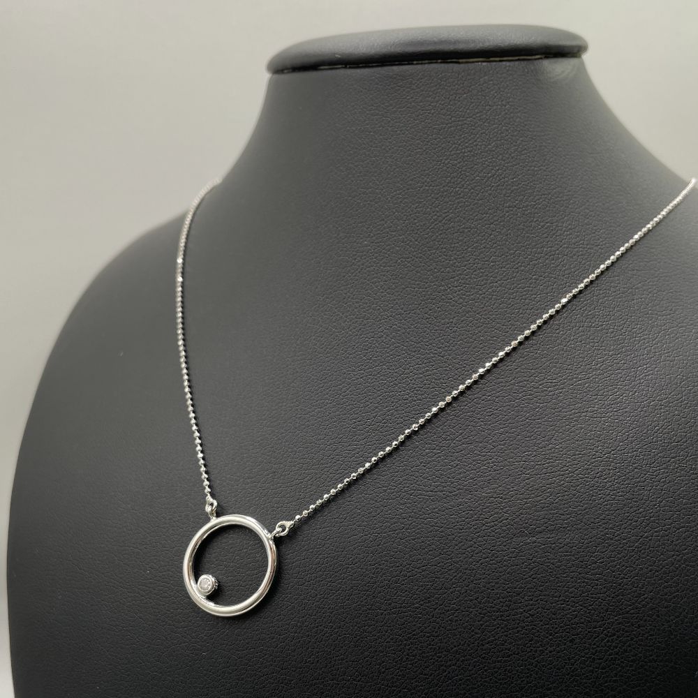 Colier scurt realizat din argint 925 placat cu rodiu decorat cu pandantiv rotund in interiorul caruia se regaseste o piatra cubic zirconia incolora.