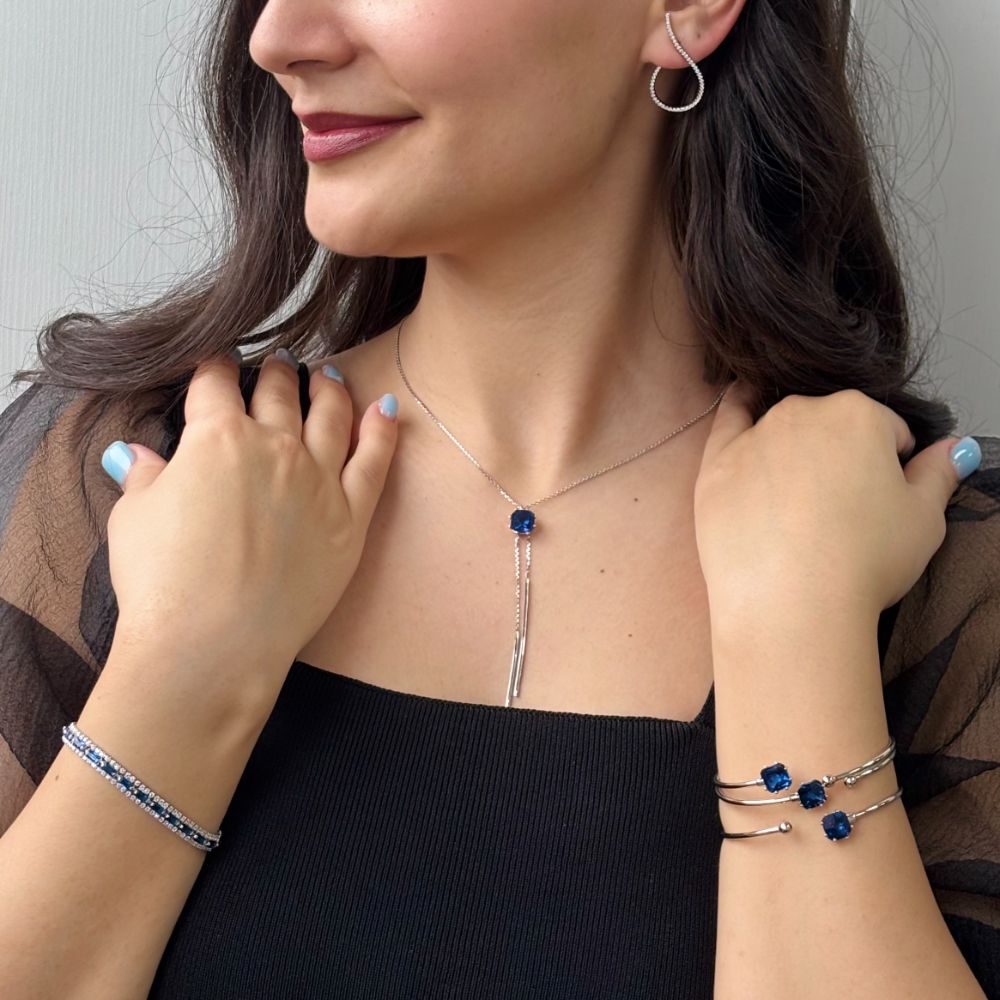 Colier tip Y din argint 925 placat cu rodiu decorat cu piatra cubic zirconia albastra.