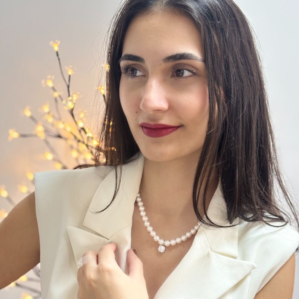Colier scurt realizat din argint 925 placat cu rodiu decorat cu perle de cultura si piatra cubic zirconia incolora.