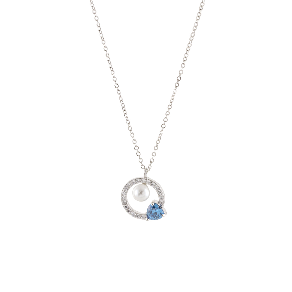 Colier placat cu rodiu si pandantiv decorat cu perla si piatra ziconia albastra Happy hearts