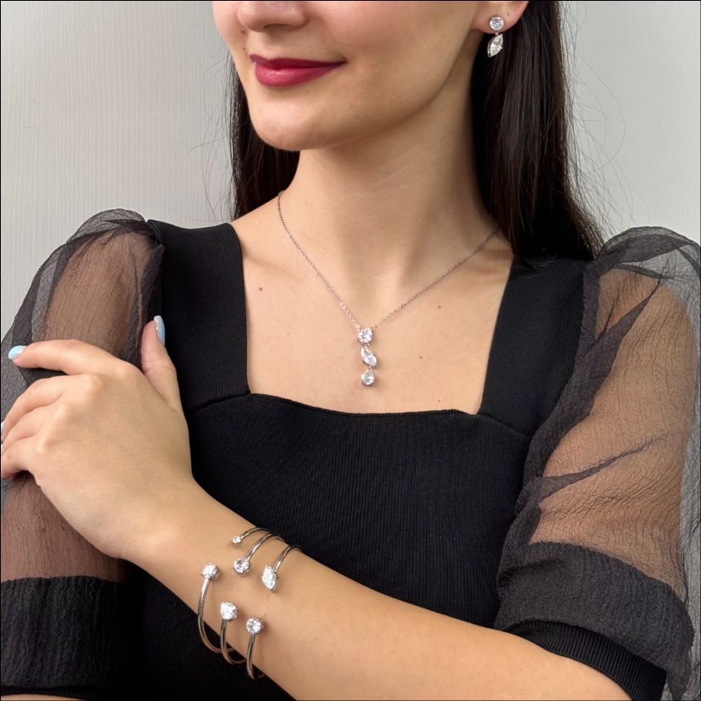 Colier realizat din otel inoxidabil placat cu rodiu cu pandantiv decorat cu pietre cubic zirconia incolore.