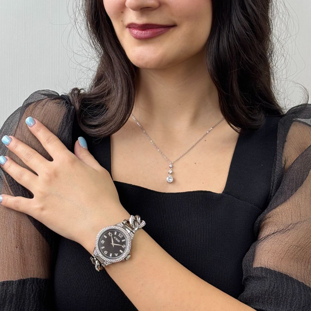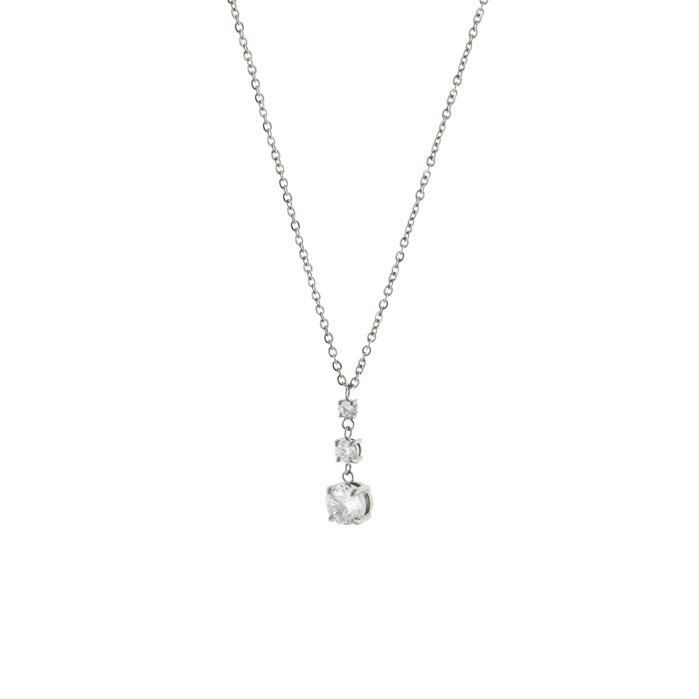 Colier cu pandantiv realizat din otel inoxidabil placat cu rodiu decorat cu pietre cubic zirconia incolore.
