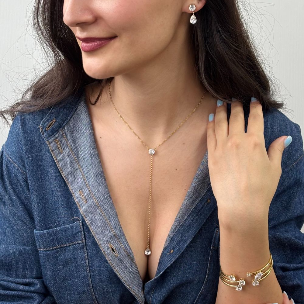 Colier tip Y realizat din otel inoxidabil placat cu aur 18K decorat cu pietre cubic zirconia incolore.