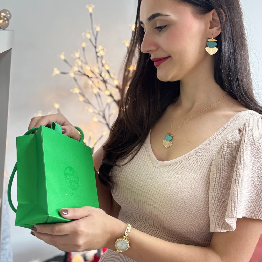 Colier scurt realizat din argint 925 placat cu aur galben de 18K decorat cu 2 pandantive geometrice dintre care unul verde.