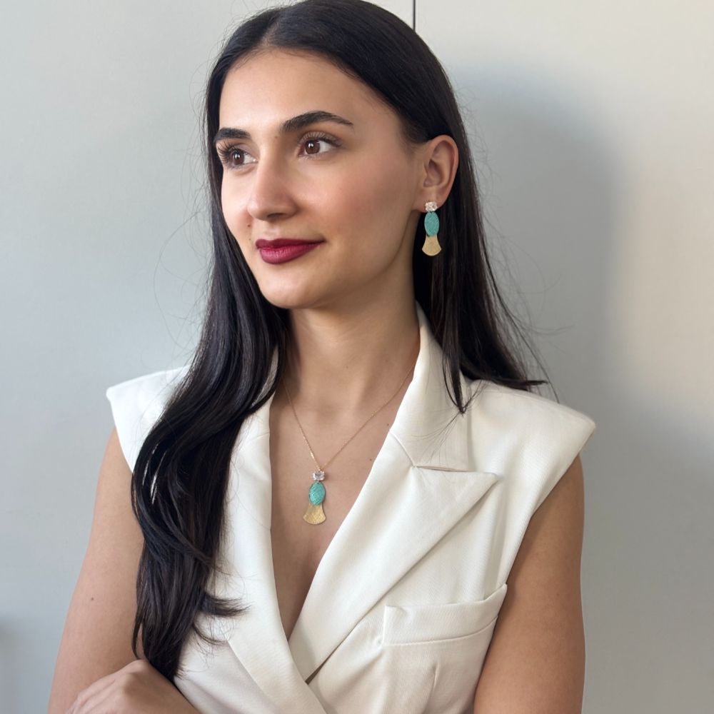 Colier realizat din argint 925 placat cu aur galben de 18K decorat cu pandantiv geometrice aurii si verde si o piatra cubic zirconia incolora.