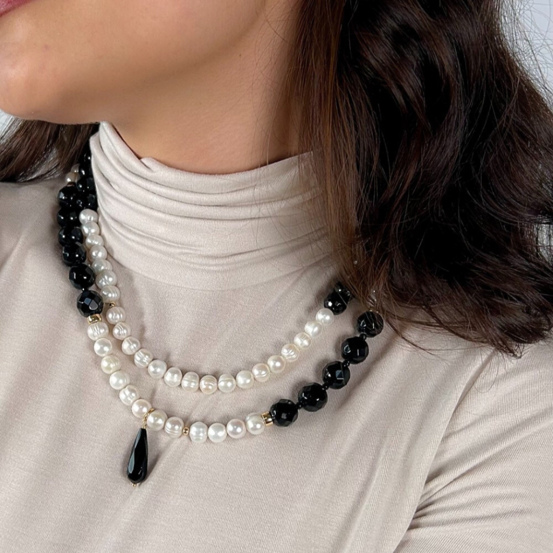 Combinatia de onix negru si perle de cultura adauga un aer rafinat, perfect pentru tinute chic de zi sau elegante de seara. Ideal pentru un look modern si distins!