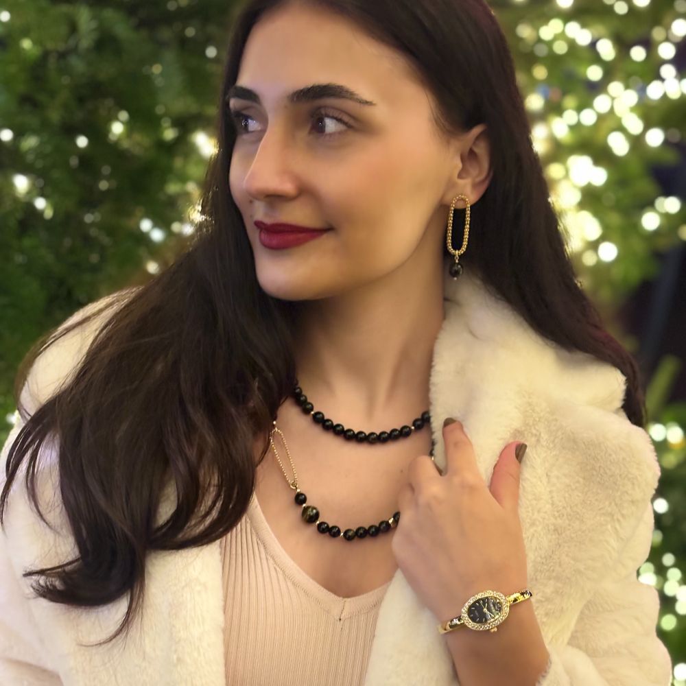Descrierea produsului Colier dublu argint placat cu aur de 18K cu obsidian negru Holiday: