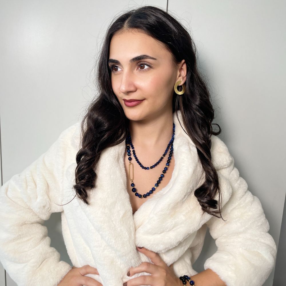 Completeaza-ti tinuta cu colierul Holiday purtat peste un top sau rochie minimalista, cu parul lejer aranjat si machiaj delicat care scoate subtil in evidenta nuanta albastra a pietrelor.