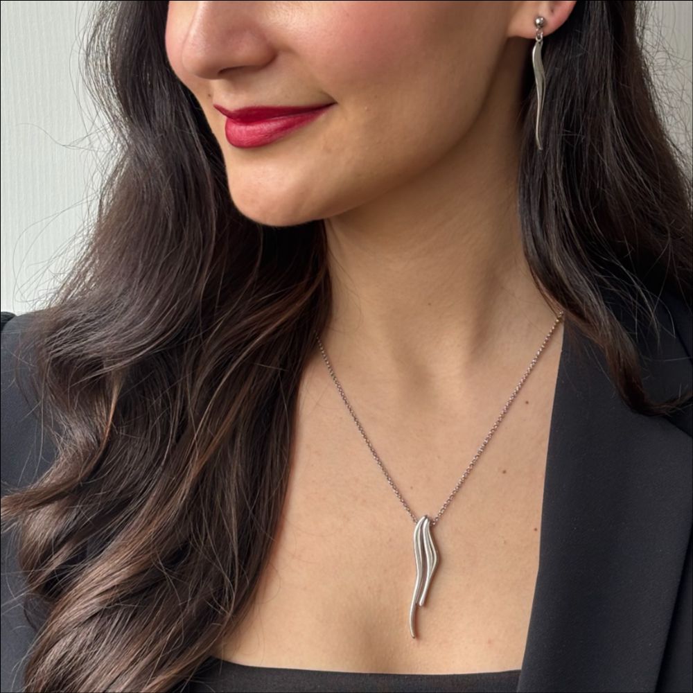Acest colier cu linii organice este piesa esentiala pentru un look modern si rafinat. Datorita formei sale alungite, se asaza impecabil pe un decolteu in V sau peste o maleta intr-o culoare inchisa, creand un efect vizual de alungire si eleganta.