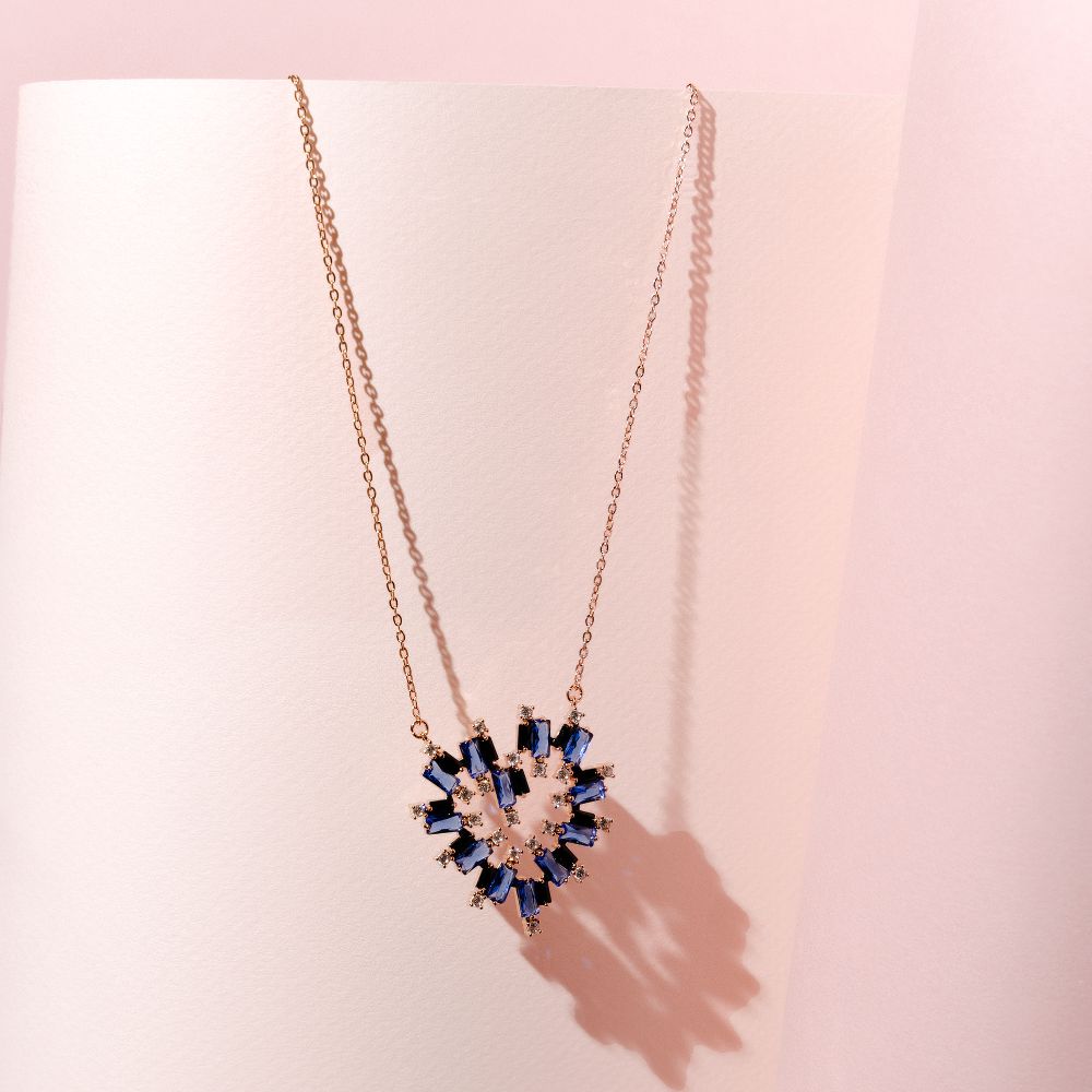 Colier realizat din metal comun placat cu aur roz de 18 K decorat cu pietre cubic zirconia albastre, negre si incolore dispuse sub forma unei inimi. Recomandari de purtare: