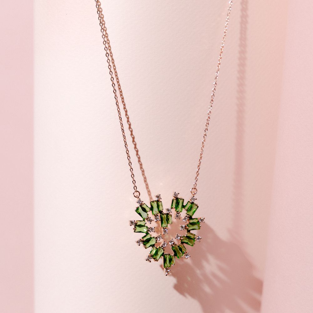 Colier placat cu aur roz de 18 K decorat cu inima presarat cu pietre verzi si incolore Look at Me