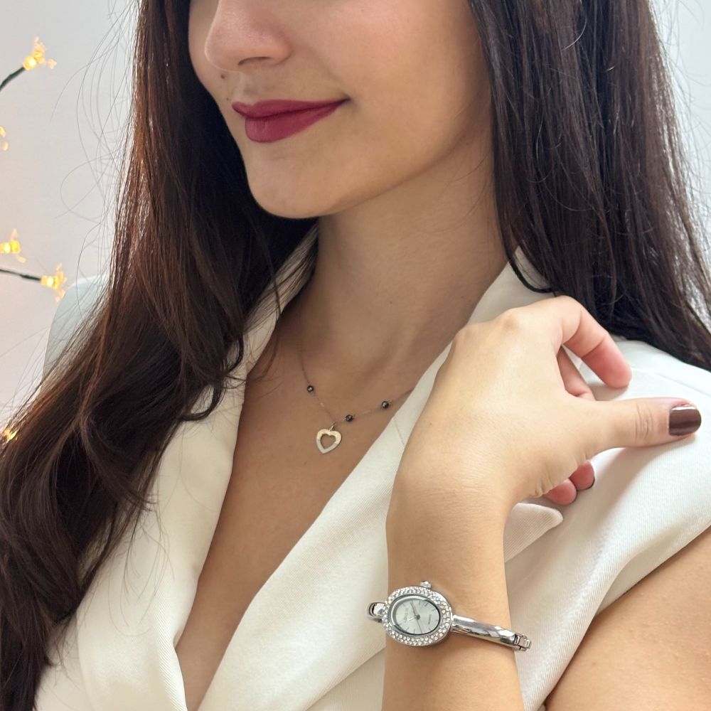 Colier scurt realizat din argint 925 placat cu rodiu decorat din loc in loc cu hematite si un pandantiv inima.