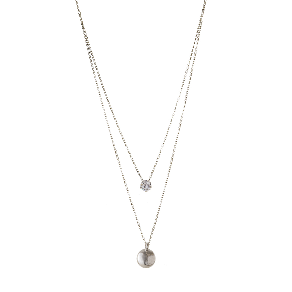 Colier dublu realizat din argint 925 placat cu rodiu decorat cu pandantiv sfera si o piatra cubic zirconia incolora.
