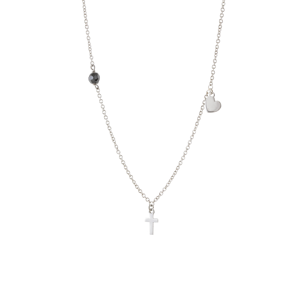 Colier cu elemente cruce si inima realizat din argint placat cu rodiu decorat cu hematit.