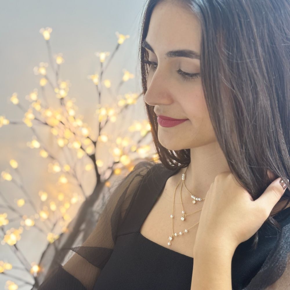 Poarta colierul Lovely ca accent luminos, integrat intr-o tinuta lejera sau eleganta, pentru a aduce echilibru si finete zonei gatului.