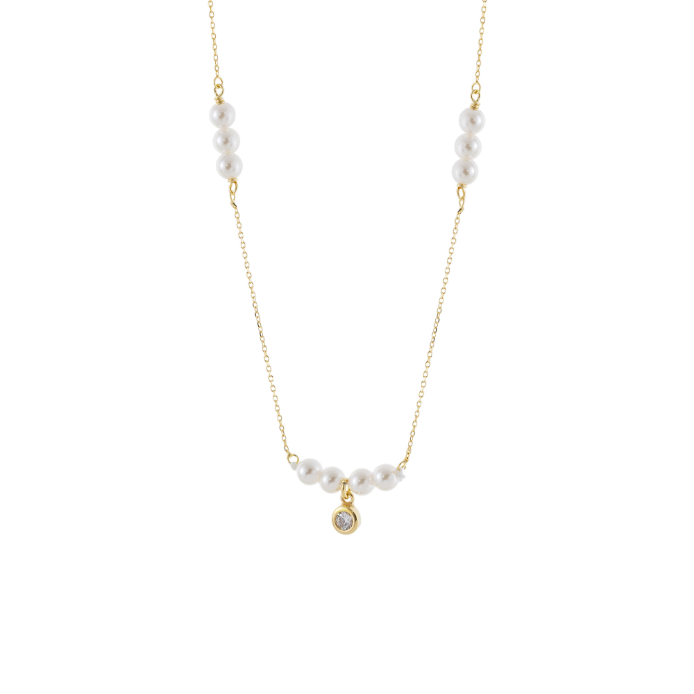 Colier scurt realizat din argint 925 placat cu aur galben de 18K decorat cu perle de sticla si piatra cubic zirconia incolora.