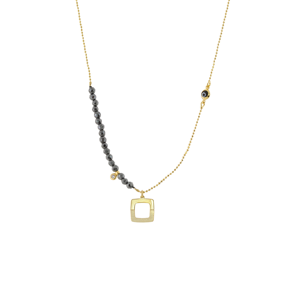 Colier cu pandantiv realizat din argint placat cu aur 18K decorat cu hematite si pietre cubic zirconia incolore.