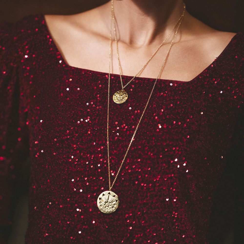 Descrierea produsului Colier lung placat cu aur de 18K cu pandantiv rotund si simboluri Lucky Charm: