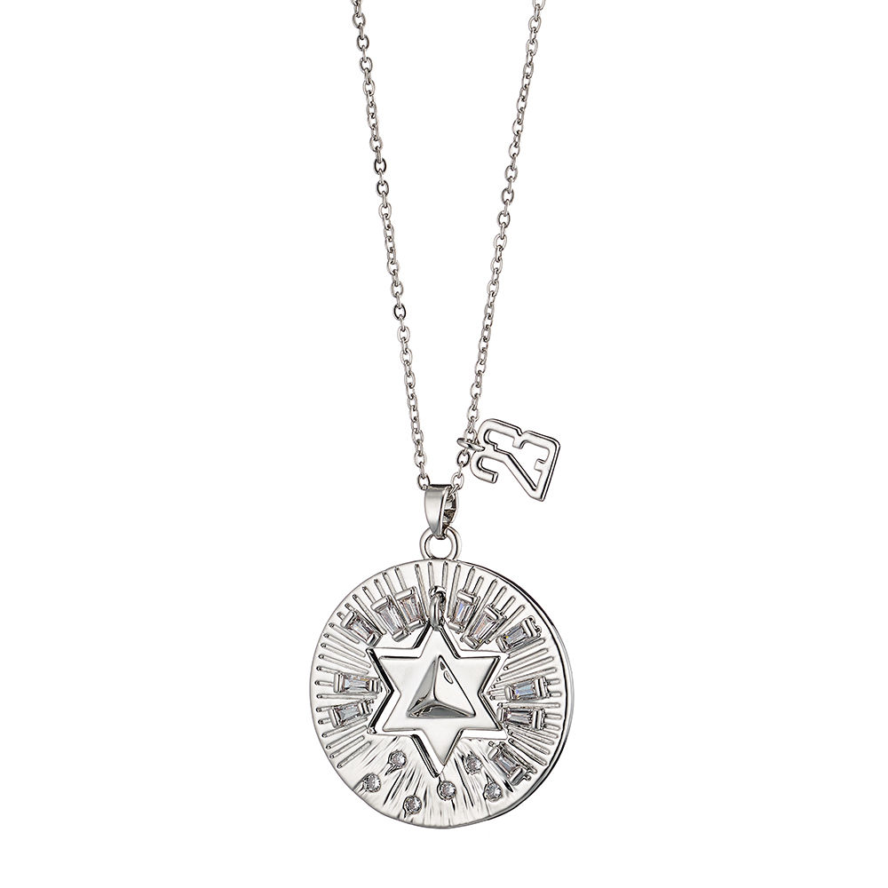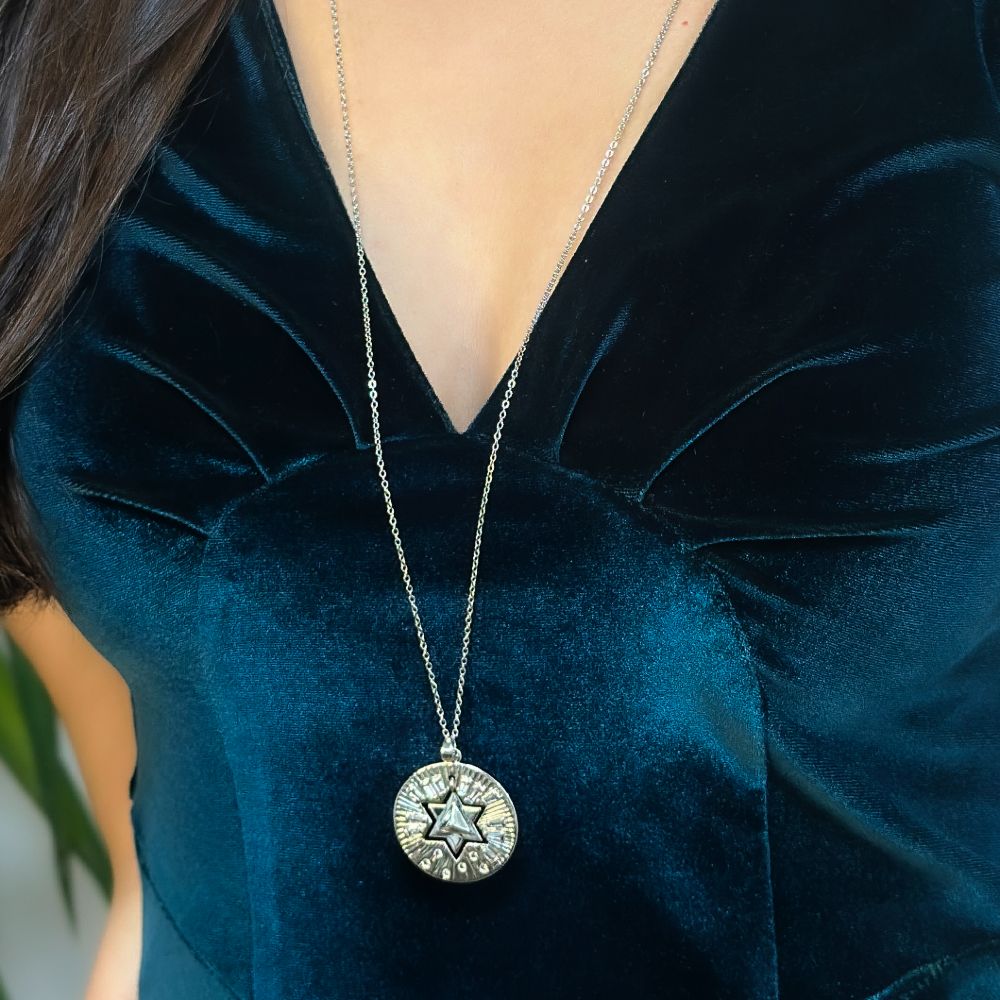 Colier lung realizat din metal comun placat cu rodiu si decorat cu pandantiv round in interiorul caruia se afla o stea.