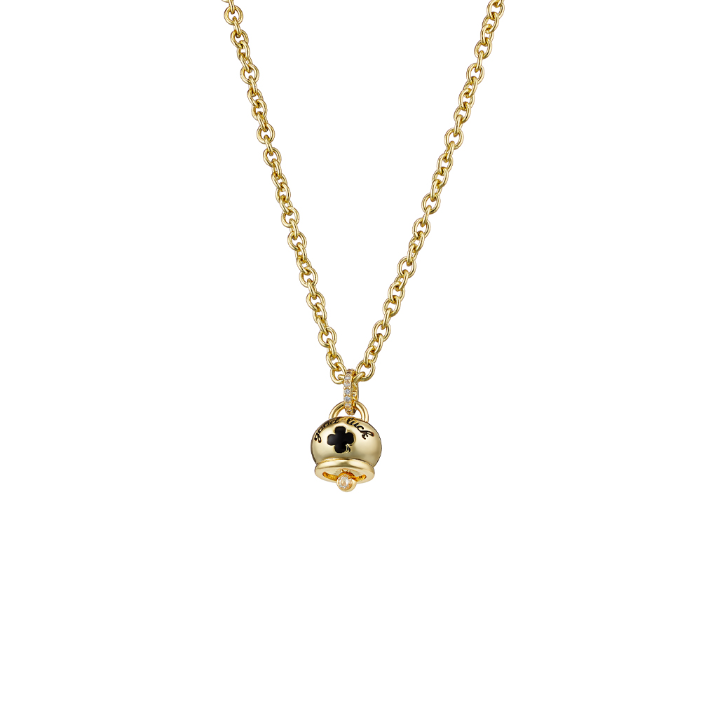 Colier mediu realizat din metal comun placat cu aur galben de 18K decorat cu clopotel pe care se regaseste un trifoi negru si “Good luck”.