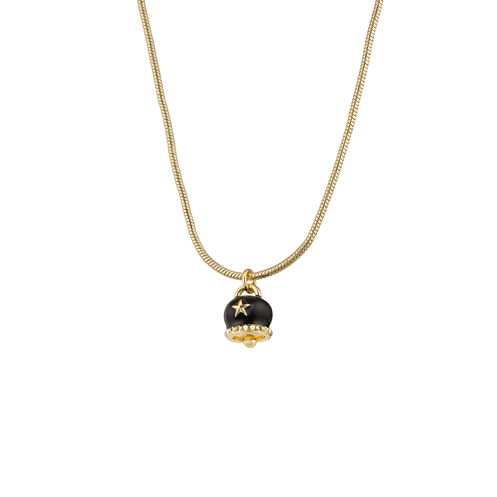 Colier mediu realizat din metal comun placat cu aur galben de 18K decorat cu clopotel placata cu email negru, o stea si o piatra cubic zirconia incolora.