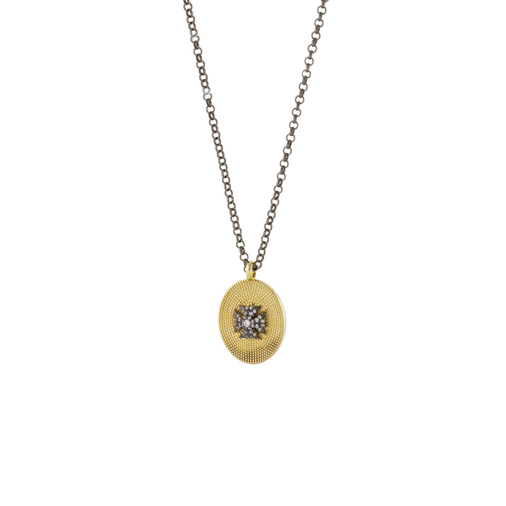 Colier scurt realizat din metal comun placat cu ruteniu si pandantiv oval placat cu aur de 18K presarat cu pietre cubic zirconia incolore dispuse sub forma unei cruci.