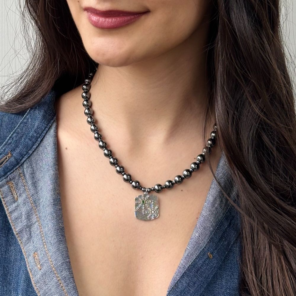 Colier scurt placat cu rodiu decorat cu hematite gri si cristale zirconia incolore si verzi Natrix Bis